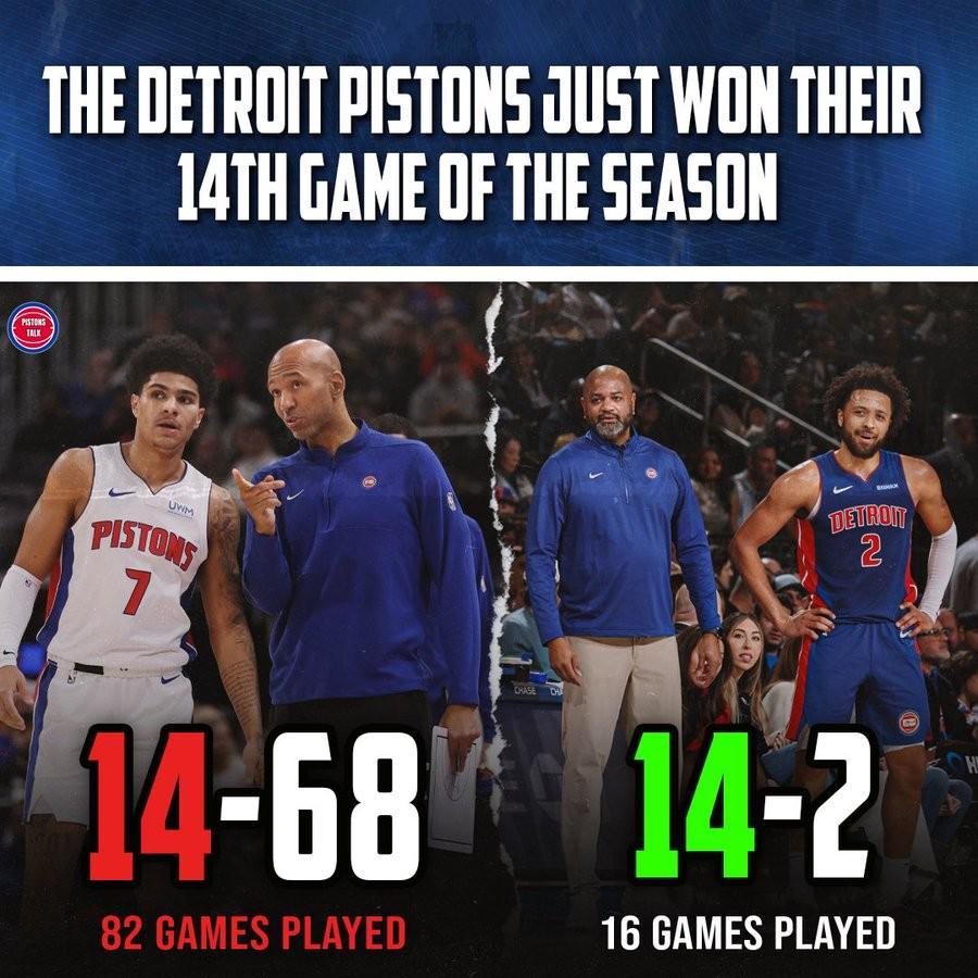 在兩年前的2023-24賽季,致力于擺爛的活塞隊整個賽季才取得了14勝并排名當(dāng)賽季倒數(shù)第一,在2023年他們還遭遇令人震驚的28連敗,這追平了NBA歷史上的跨賽季連敗紀(jì)錄。如今,他們?nèi)〉昧俗?003-04奪冠賽季以來的最長連勝12連勝,開季僅用16場就追平了23-24賽季的勝場數(shù)。