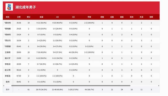 湖北男籃:王曉明20分1板2助、侯興宇12分5板3助、薛世偉10分8板2助、李柏潤7分1助、李慕豪6分1板;