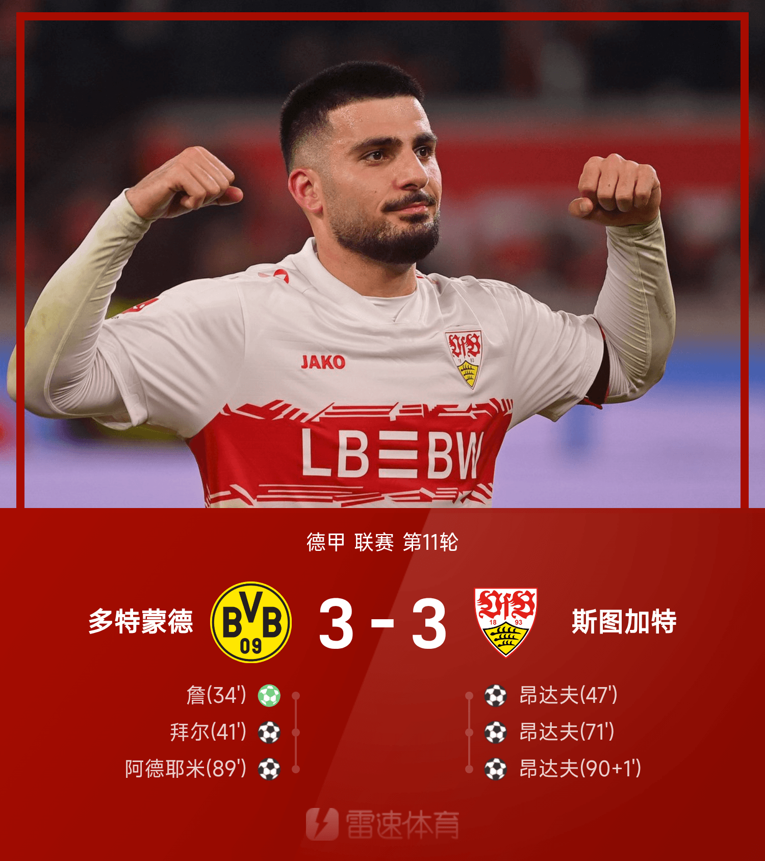 德甲戰(zhàn)報(bào):昂達(dá)夫戴帽+絕平,多特蒙德3-3斯圖加特
