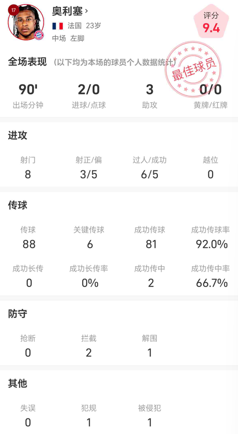 單場(chǎng)比賽參與5球,23歲的奧利塞打破拜仁兩項(xiàng)紀(jì)錄