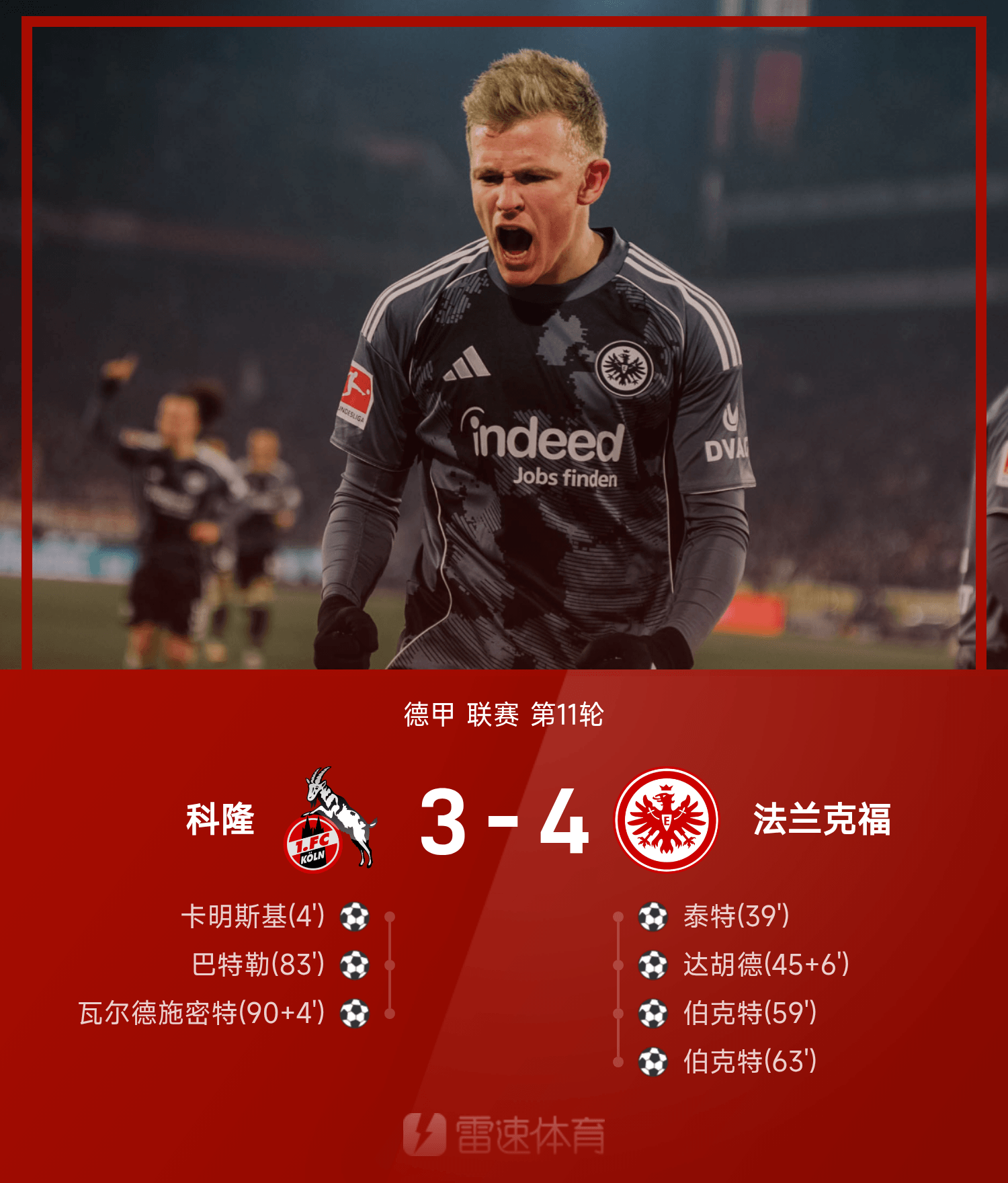 雷速體育11月23日訊 25/26賽季德甲聯(lián)賽第11輪,法蘭克福4-3戰(zhàn)勝科隆。