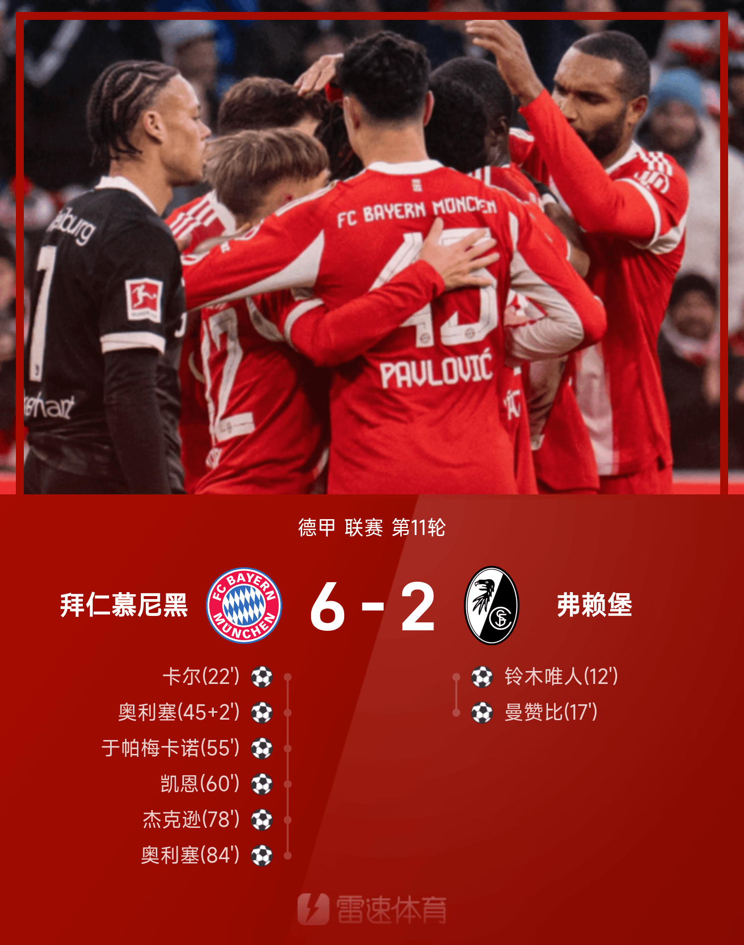 雷速體育11月23日訊 在剛剛結(jié)束的德甲聯(lián)賽第11輪比賽,拜仁6-2逆轉(zhuǎn)大勝弗賴堡。