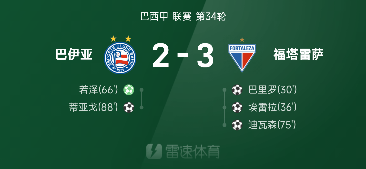 雷速體育11月21日訊 25賽季巴西甲聯(lián)賽第34輪,福塔雷薩3-2戰(zhàn)勝巴伊亞。