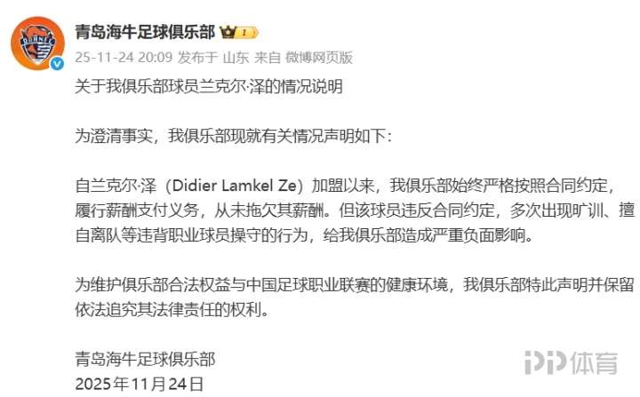 海牛官方:從未拖欠蘭克爾·澤薪酬 但其多次曠訓(xùn)、擅自離隊(duì)