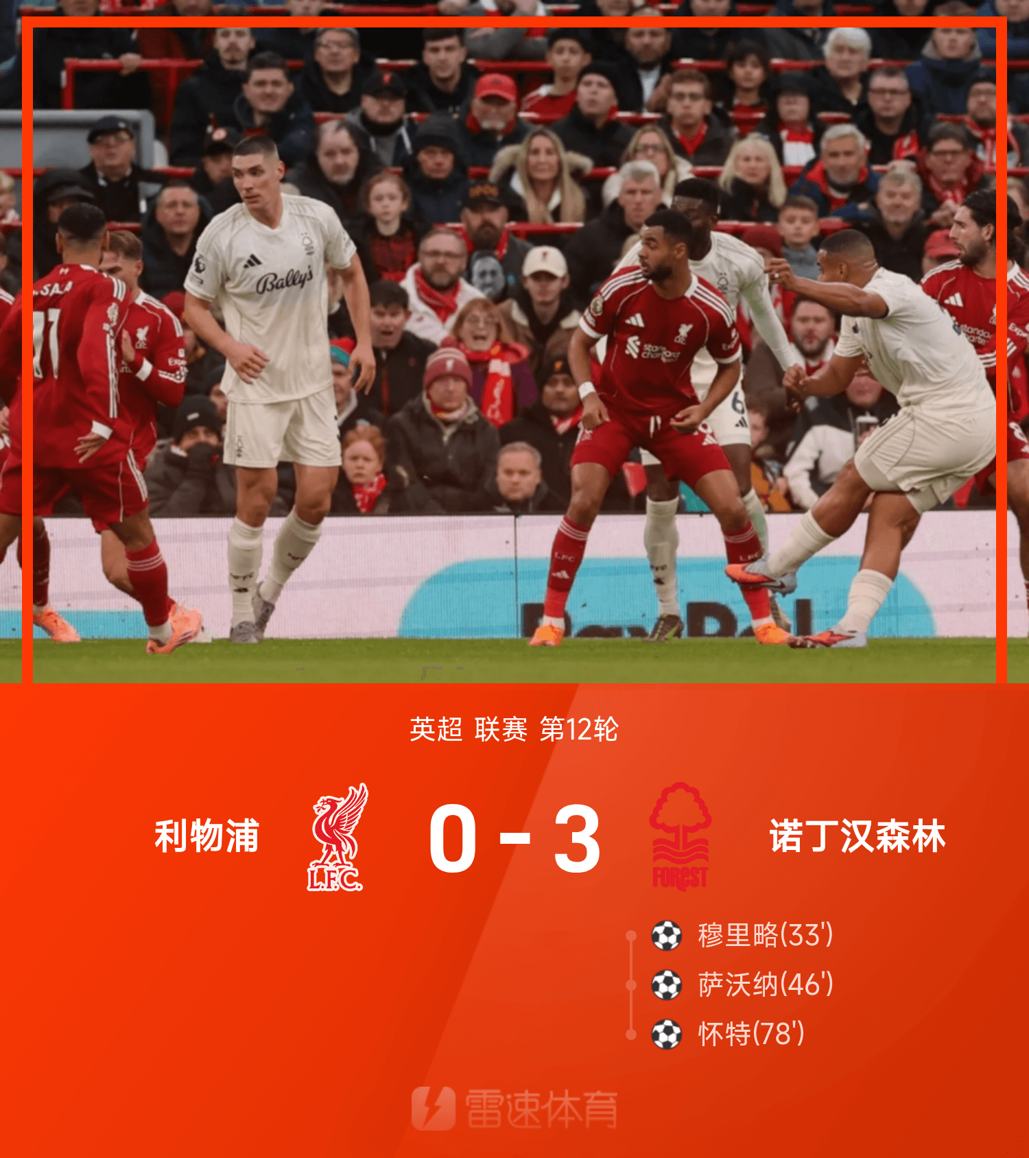英超戰(zhàn)報(bào):薩沃納破門,懷特建功,諾丁漢森林3-0利物浦