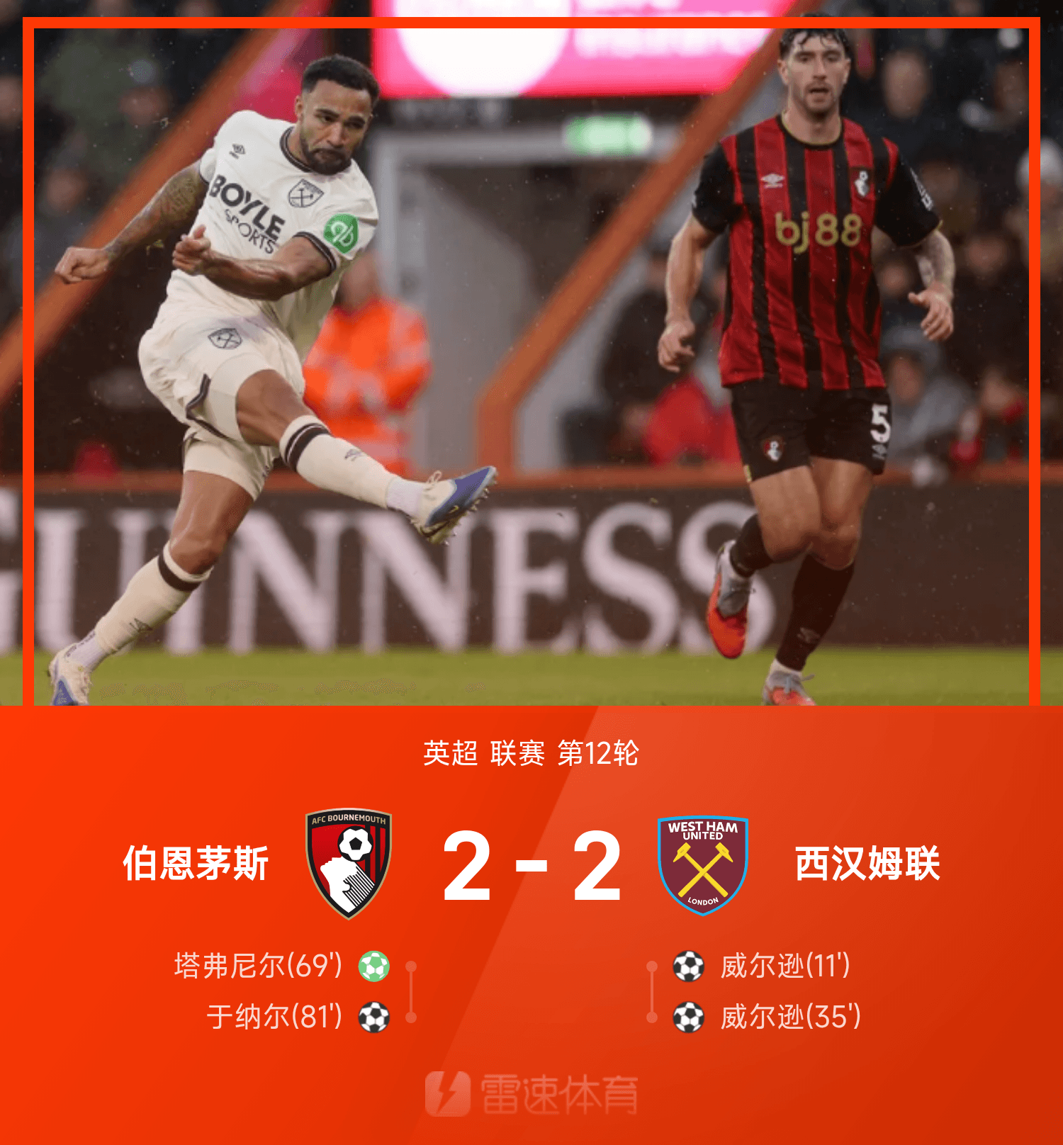 雷速體育11月23日訊 25/26賽季英超聯(lián)賽第12輪,伯恩茅斯2-2戰(zhàn)平西漢姆聯(lián)。
