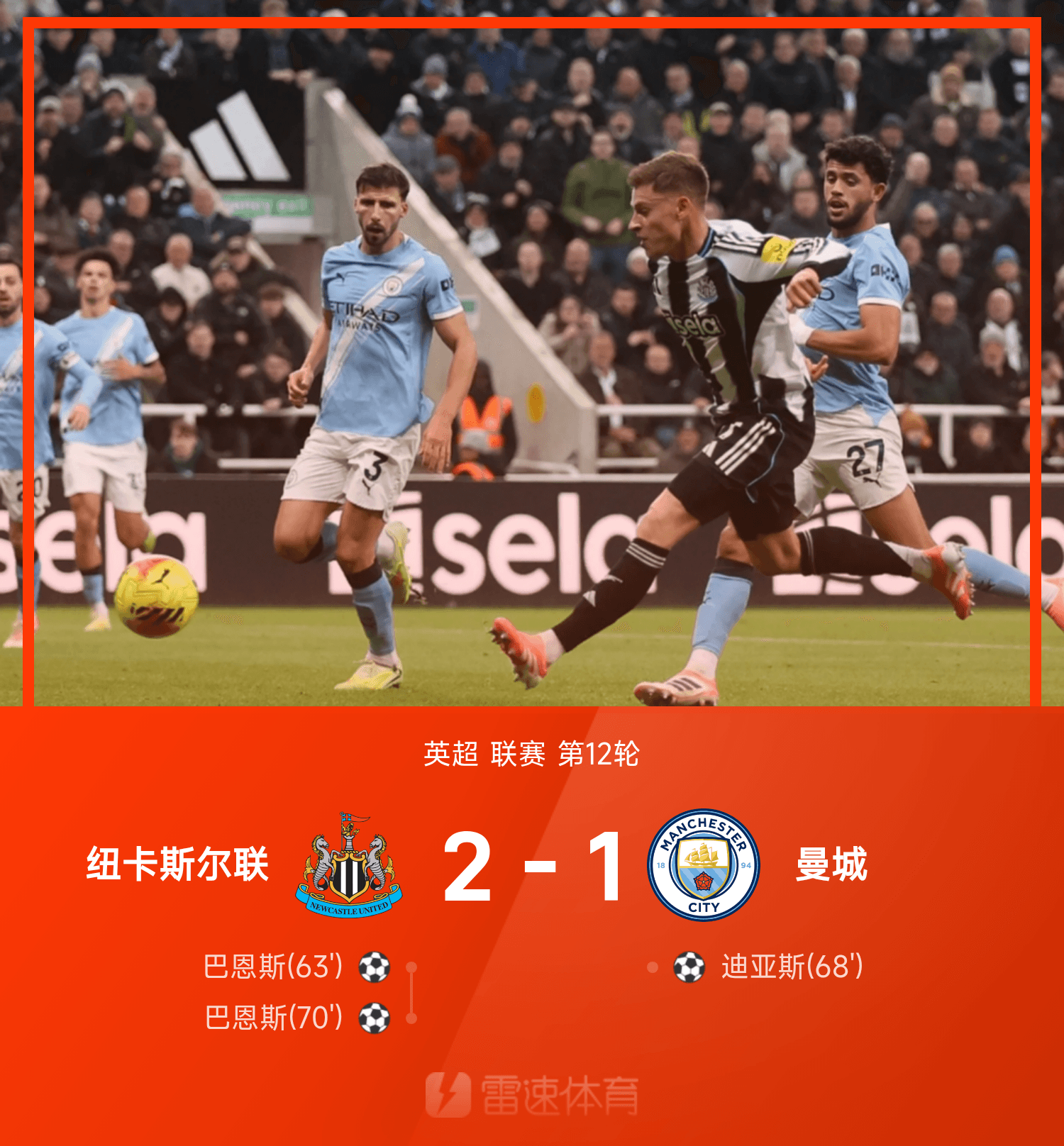 雷速體育11月23日訊 稍早前結(jié)束的英超聯(lián)賽中,紐卡斯?fàn)柭?lián)主場2-1擊敗曼城。