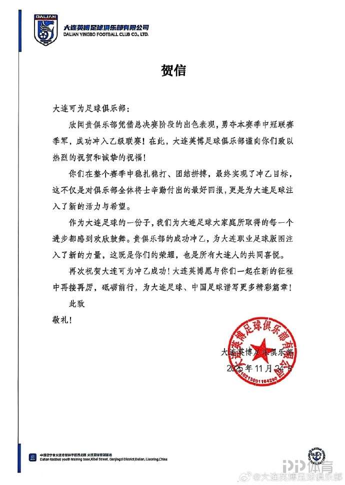 大連英博祝賀大連可為沖乙成功:為大連職業(yè)足球版圖注入新的力量