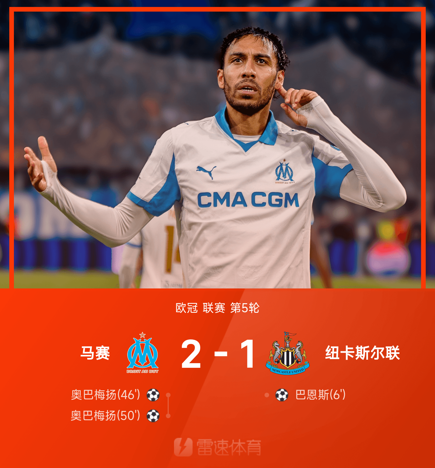 雷速體育11月26日訊 歐冠聯(lián)賽階段第5輪,馬賽主場(chǎng)2-1擊敗紐卡斯?fàn)柭?lián)。