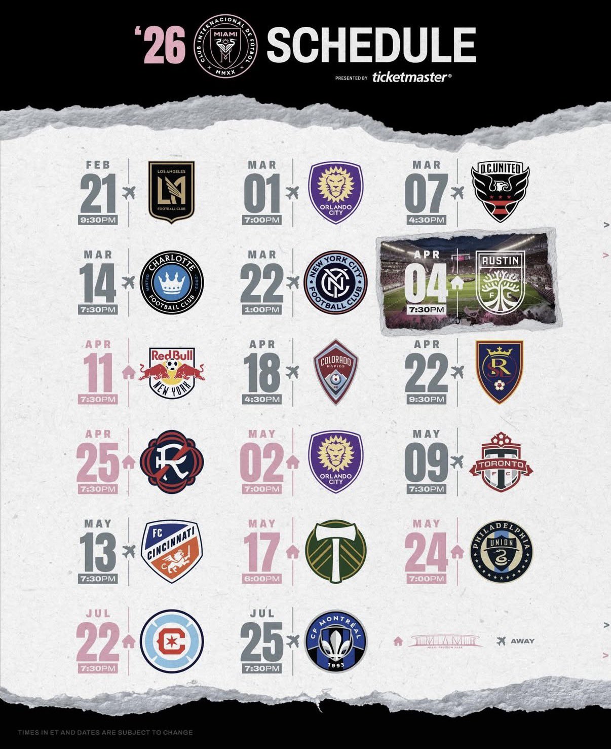 雷速體育11月21日訊 今日,美職聯(lián)官方公布了2026賽季的完整賽程,其中邁阿密國際首輪將做客對陣洛杉磯FC。