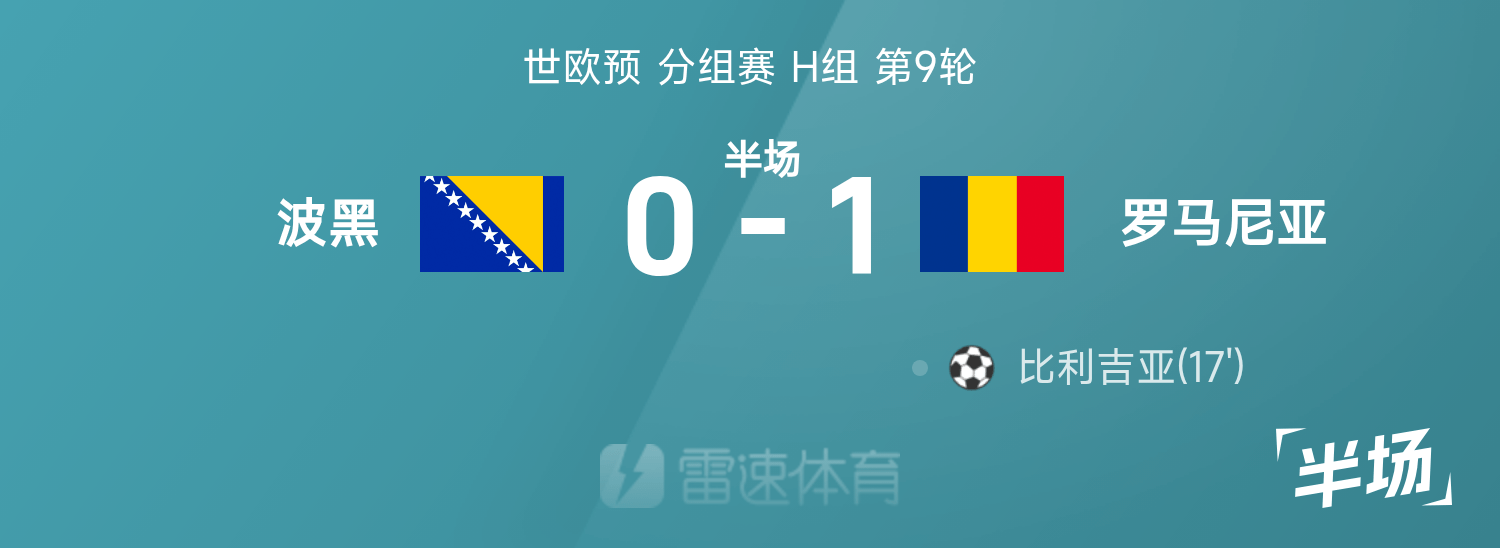 雷速體育11月16日訊 26賽季世歐預分組賽H組第9輪,波黑迎戰(zhàn)羅馬尼亞。半場戰(zhàn)罷,雙方比分暫為波黑0-1羅馬尼亞,比利吉亞破門建功。