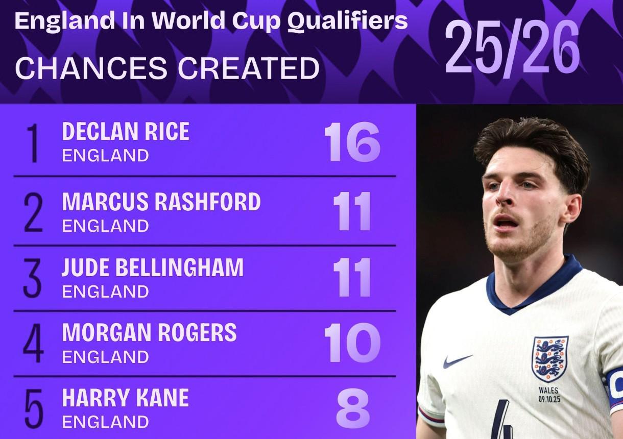 根據(jù)Squawka的統(tǒng)計,在本屆世預(yù)賽歐洲區(qū)的比賽中,賴斯一共為英格蘭隊創(chuàng)造了16次機會,這一數(shù)據(jù)排在隊內(nèi)所有球員的第一位,比排名并列第二的拉什福德和貝林厄姆多出了5次。