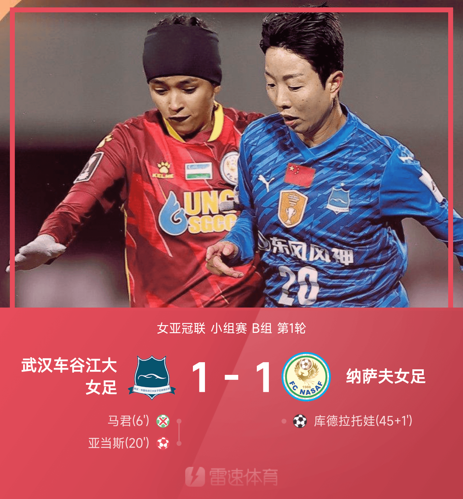 雷速體育11月17日訊 25/26賽季女亞冠聯(lián)小組賽B組第1輪,武漢車谷江大女足1-1戰(zhàn)平納薩夫女足。王霜、姚偉等主力因全運(yùn)缺席。全場比賽,馬君第6分鐘錯失點(diǎn)球首開記錄良機(jī),亞當(dāng)斯自擺烏龍幫助武漢女足領(lǐng)先,隨后庫德拉托娃破門扳平。全場比賽兩隊(duì)1-1戰(zhàn)平,武漢女足無緣亞冠開門紅。