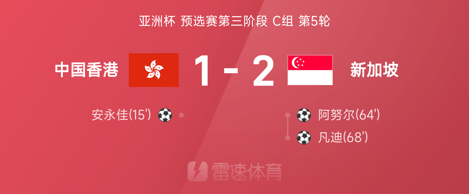 雷速體育11月18日訊 27賽季亞洲杯預(yù)選賽第三階段C組第5輪,新加坡2-1戰(zhàn)勝中國香港。全場比賽,凡迪發(fā)揮出色貢獻1射1傳,阿努爾破門建功,安永佳破門難救主。