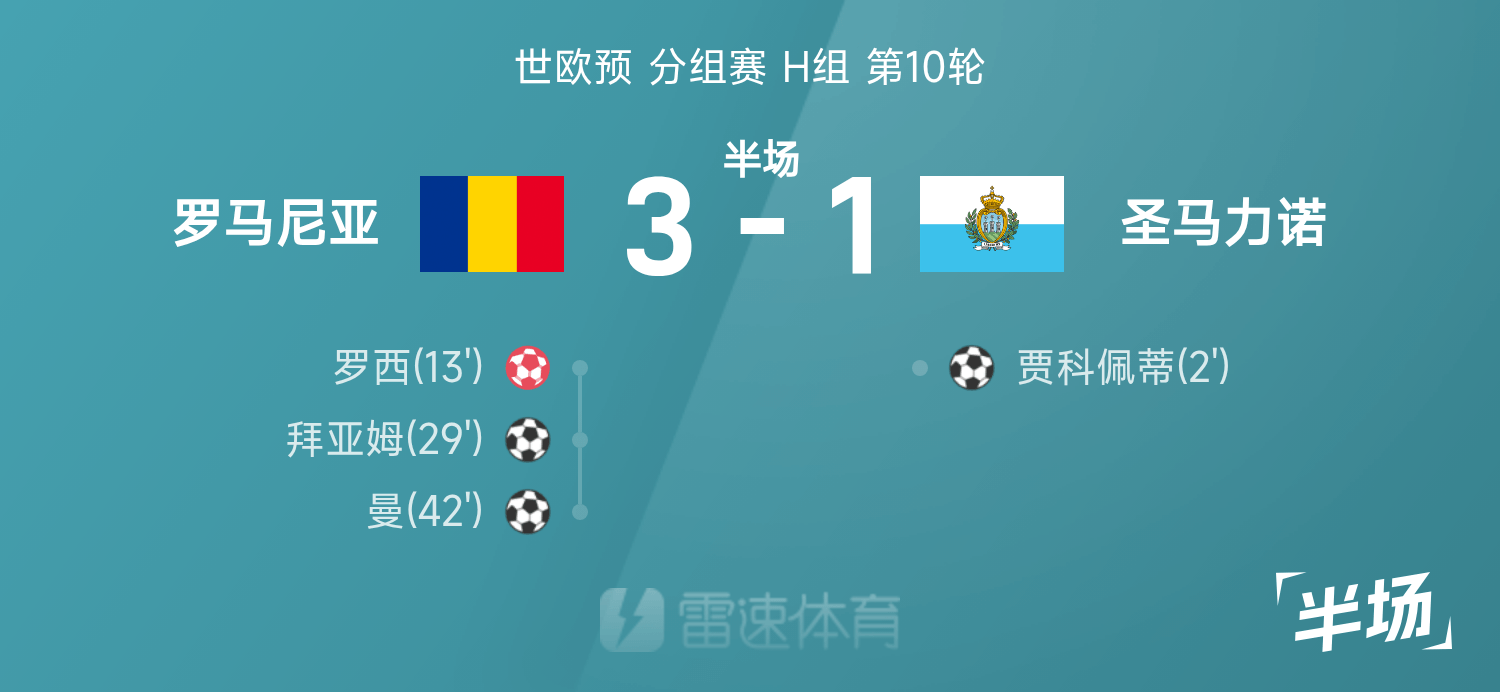 雷速體育11月19日訊 26賽季世歐預(yù)分組賽H組第10輪,羅馬尼亞迎戰(zhàn)圣馬力諾。半場(chǎng)戰(zhàn)罷,雙方比分暫為羅馬尼亞3-1圣馬力諾,曼、拜亞姆、賈科佩蒂破門建功,羅西自擺烏龍。