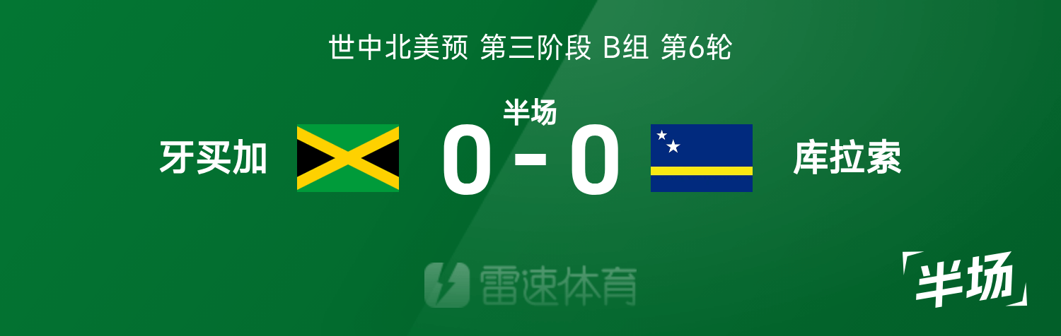 雷速體育11月19日訊 26賽季世中北美預(yù)第三階段B組第6輪,牙買加迎戰(zhàn)庫拉索。半場戰(zhàn)罷,雙方比分暫為牙買加0-0庫拉索。
