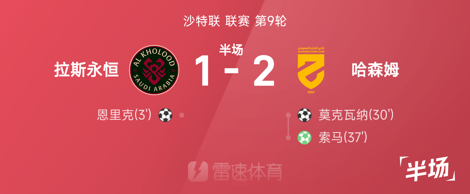 雷速體育11月21日訊 25/26賽季沙特聯(lián)聯(lián)賽第9輪,拉斯永恒迎戰(zhàn)哈森姆。開場僅僅3分鐘,恩里克閃擊破門,莫克瓦納扳平比分之后又造點,索馬主罰命中反超。半場戰(zhàn)罷,哈森姆暫2-1領先拉斯永恒。