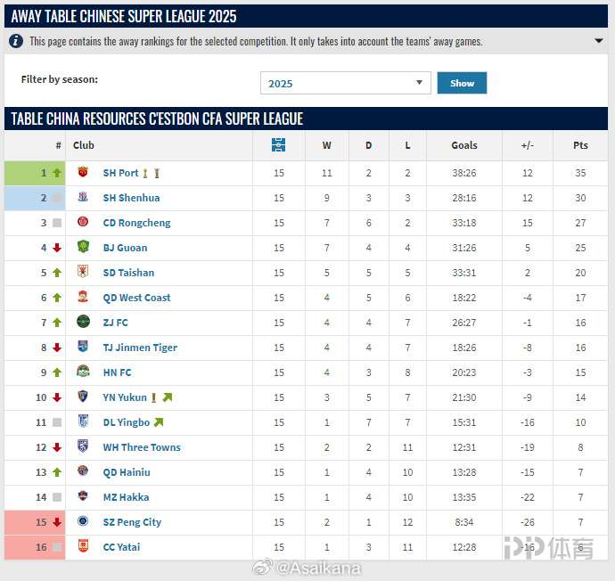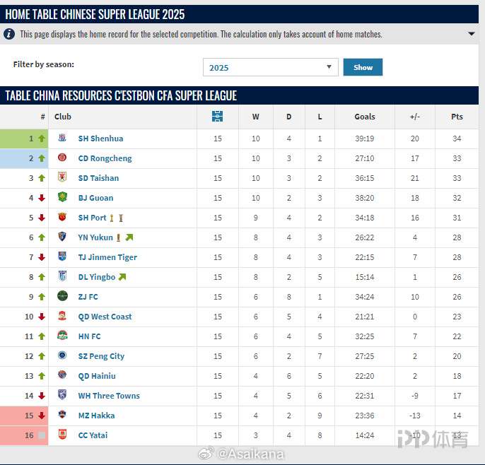 德轉管理員朱藝在社媒公布了本賽季中超各隊主客場戰(zhàn)績情況,其中本賽季聯(lián)賽上海申花主場成績最佳,15場比賽拿到34分。上海海港客場成績最佳,15場比賽拿到35分。