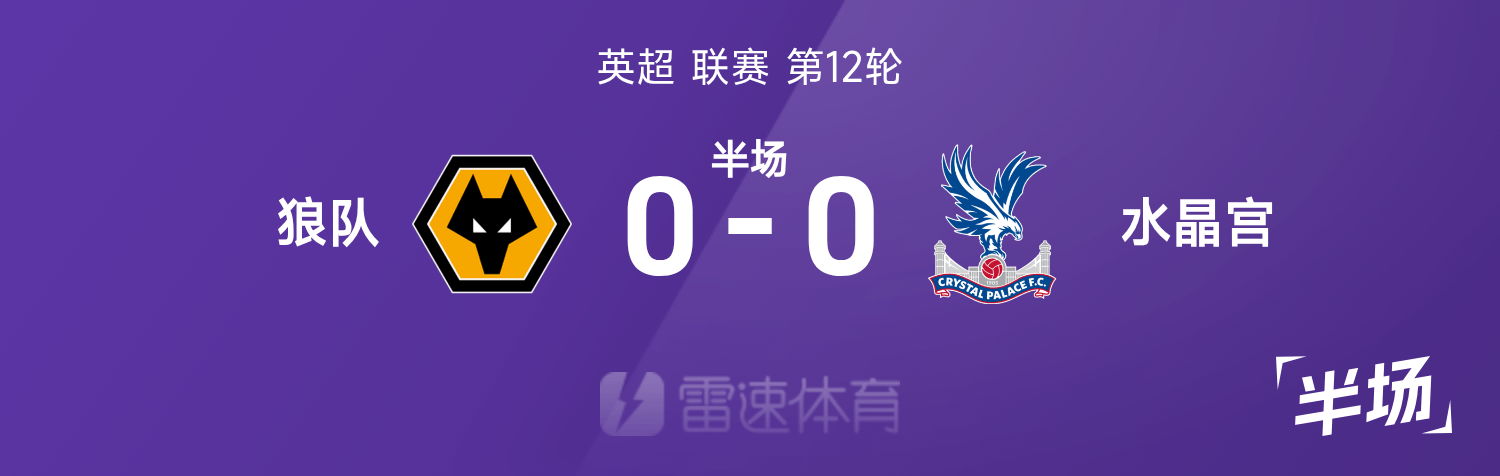 雷速體育11月22日訊 25/26賽季英超聯(lián)賽第12輪,狼隊(duì)迎戰(zhàn)水晶宮。半場(chǎng)戰(zhàn)罷,雙方比分暫為狼隊(duì)0-0水晶宮。
