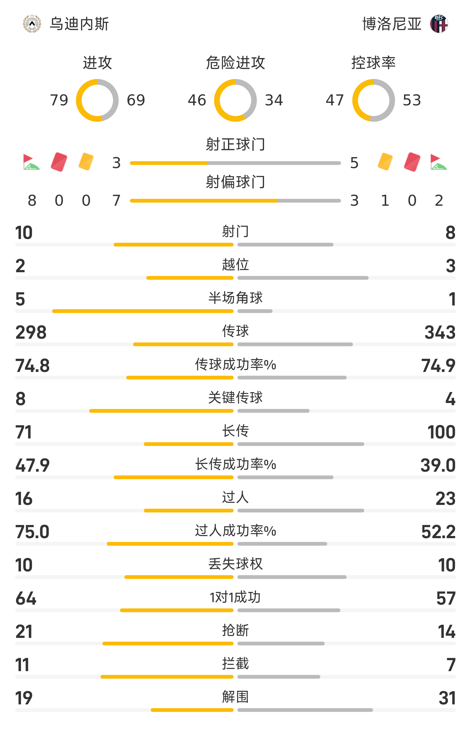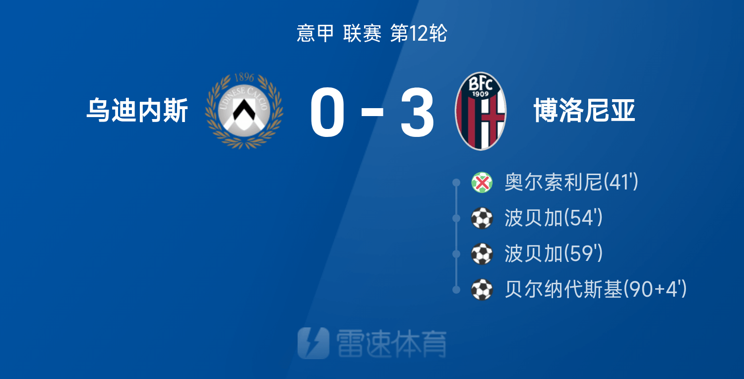 雷速體育11月23日訊 25/26賽季意甲聯(lián)賽第12輪,博洛尼亞3-0戰(zhàn)勝烏迪內(nèi)斯。全場比賽,波貝加上演梅開二度,貝爾納代斯基破門建功,奧爾索利尼失點。