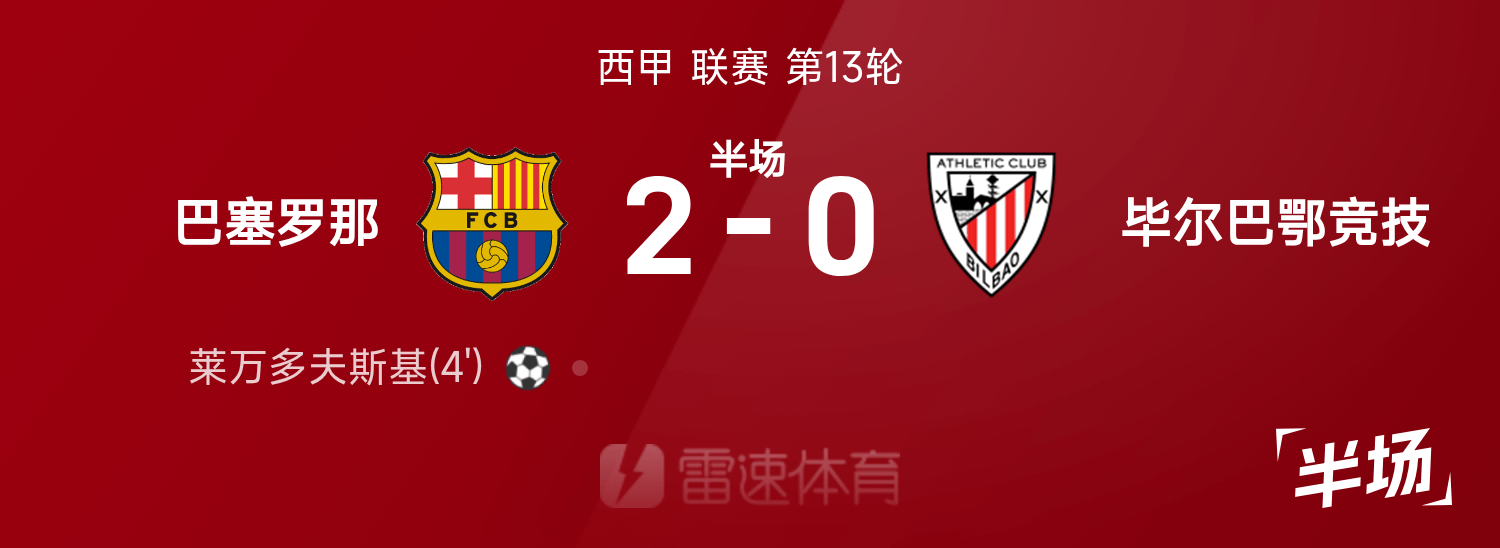 雷速體育11月23日訊 25/26賽季西甲聯(lián)賽第13輪,巴塞羅那迎戰(zhàn)畢爾巴鄂競技。半場戰(zhàn)罷,雙方比分暫為巴塞羅那2-0畢爾巴鄂競技,萊萬多夫斯基破門建功。