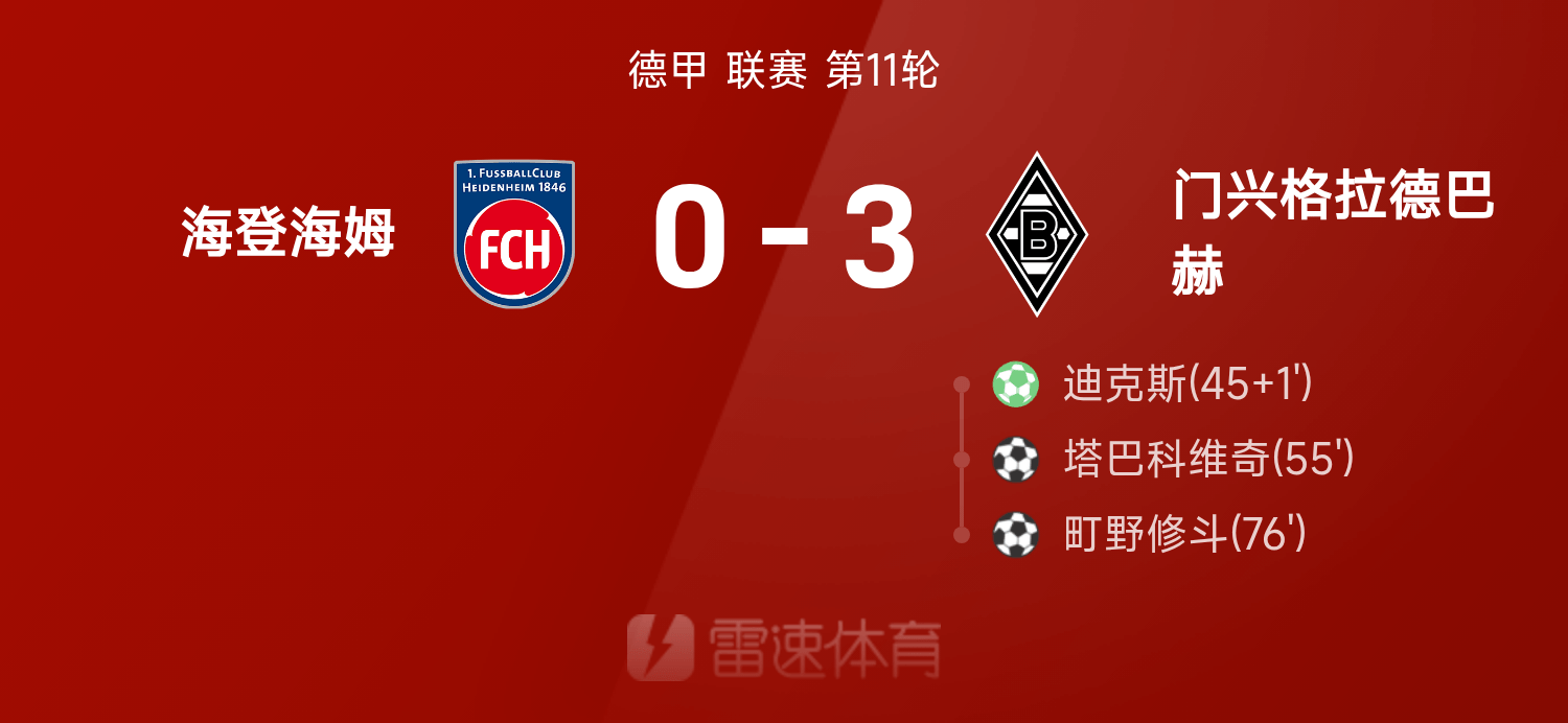雷速體育11月23日訊 25/26賽季德甲聯(lián)賽第11輪,門興格拉德巴赫3-0戰(zhàn)勝海登海姆。全場(chǎng)比賽,町野修斗、迪克斯、塔巴科維奇破門建功。