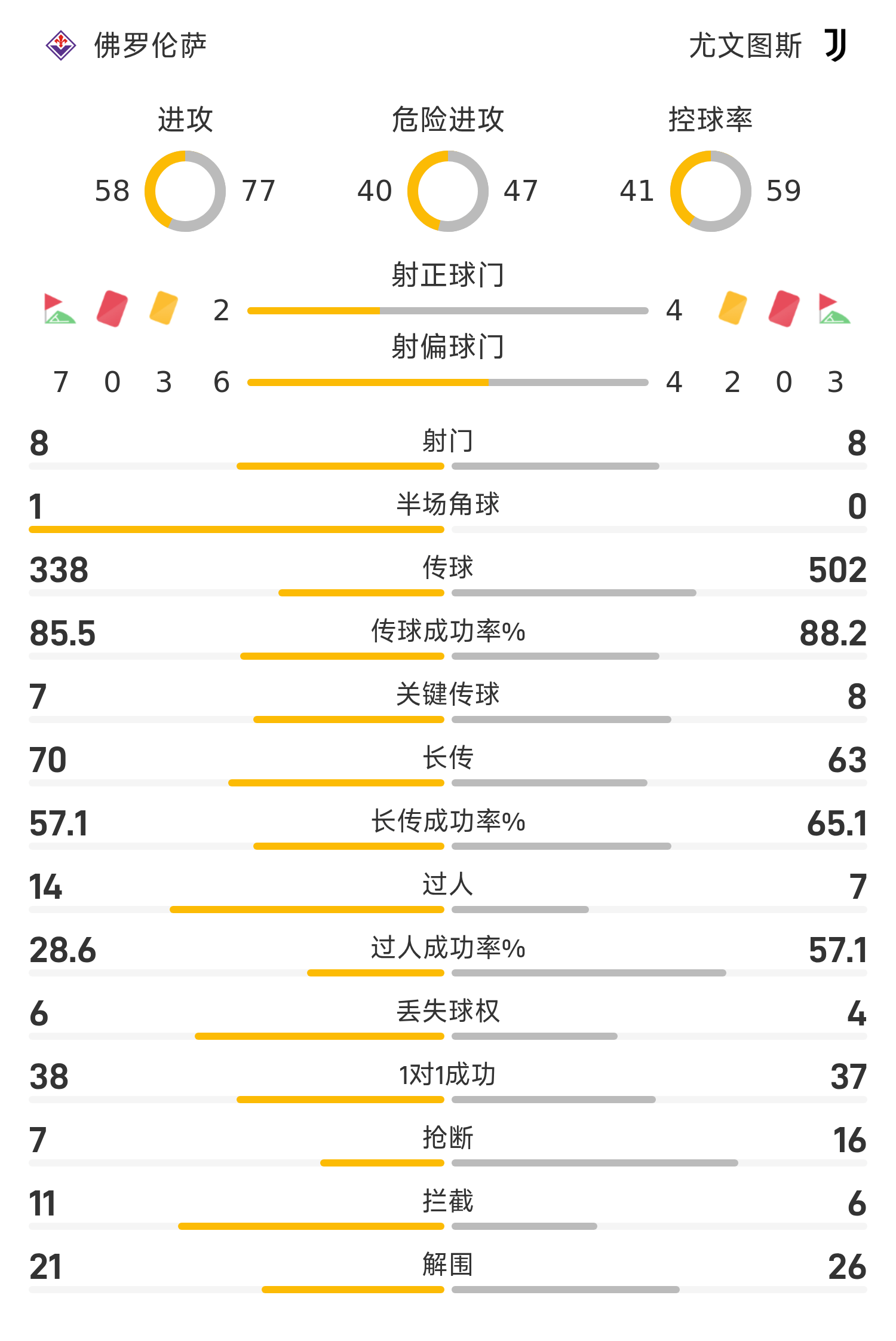雷速體育11月23日訊 25/26賽季意甲聯(lián)賽第12輪,佛羅倫薩1-1戰(zhàn)平尤文圖斯。上半場(chǎng)補(bǔ)時(shí)階段,科斯蒂奇世界波破門,幫助尤文取得領(lǐng)先。易邊再戰(zhàn),開場(chǎng)不久曼德拉戈拉同樣回敬一記世界波,將比分扳為1-1平。隨后的比賽時(shí)間內(nèi),兩隊(duì)均未能再改寫比分,最終1-1握手言和。