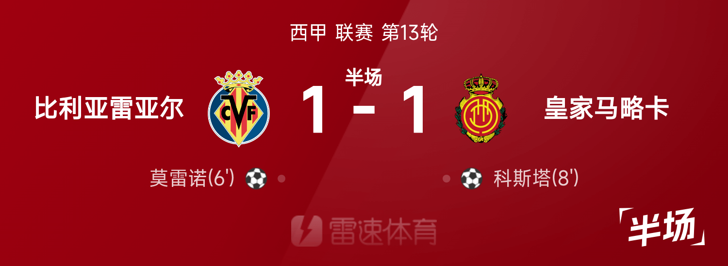雷速體育11月23日訊 25/26賽季西甲聯(lián)賽第13輪,比利亞雷亞爾迎戰(zhàn)皇家馬略卡。半場戰(zhàn)罷,雙方比分暫為比利亞雷亞爾1-1皇家馬略卡,科斯塔、莫雷諾破門建功。