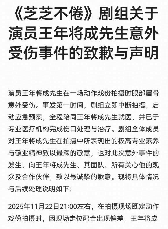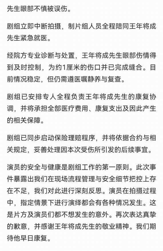事后,對(duì)手演員也在社交媒體上表達(dá)了真誠道歉,劇組也發(fā)布聲明,表示已安排專人全程負(fù)責(zé)王年將成的康復(fù)協(xié)商,并將承擔(dān)全部醫(yī)療費(fèi)用、康復(fù)支出及因此產(chǎn)生的相關(guān)保障。
