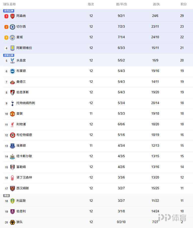 英超第12輪結束大部分比賽,阿森納4-1戰(zhàn)勝熱刺,6分領跑積分榜。切爾西第2,曼城第3,維拉客場2-1利茲聯升第4。熱刺、曼聯、利物浦分列9-11名。明日曼聯vs埃弗頓,最新積分榜如下: