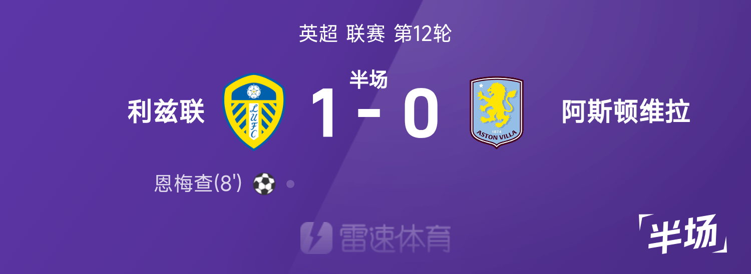 雷速體育11月23日訊 25/26賽季英超聯(lián)賽第12輪,利茲聯(lián)迎戰(zhàn)阿斯頓維拉。恩梅查破門經(jīng)VAR認(rèn)定有效,布恩迪亞任意球制造威脅,沃特金斯遠(yuǎn)射造險(xiǎn)。半場(chǎng)戰(zhàn)罷,雙方比分暫為利茲聯(lián)1-0阿斯頓維拉。