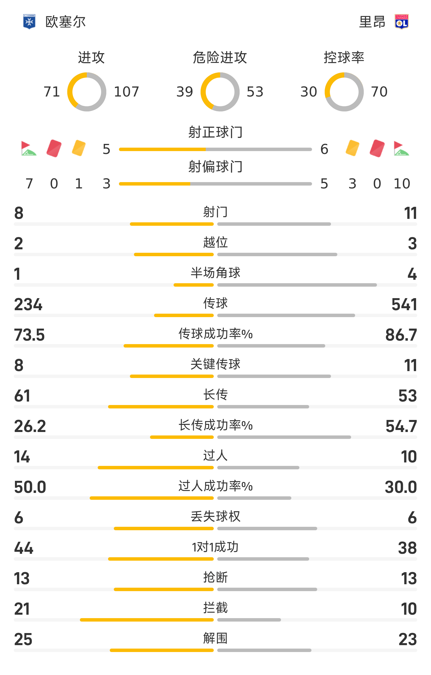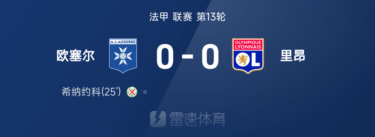雷速體育11月23日訊 25/26賽季法甲聯(lián)賽第13輪,歐塞爾0-0互交白卷悶平里昂。全場比賽,希納約科失點。
