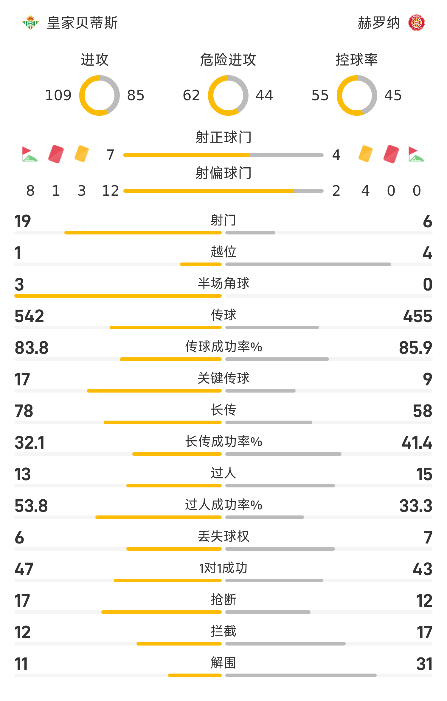 雷速體育11月24日訊 25/26賽季西甲聯(lián)賽第13輪,皇家貝蒂斯1-1戰(zhàn)平赫羅納。上半場(chǎng)第20分鐘,瓦納特破門幫助赫羅納首開紀(jì)錄。易邊再戰(zhàn),復(fù)出的伊斯科助攻戈麥斯頭球破門扳平比分。比賽最后時(shí)刻,安東尼禁區(qū)危險(xiǎn)動(dòng)作,主裁判觀看VAR后出示紅牌將其罰下。余下時(shí)間內(nèi),兩隊(duì)未能再改寫比分,最終1-1握手言和。
