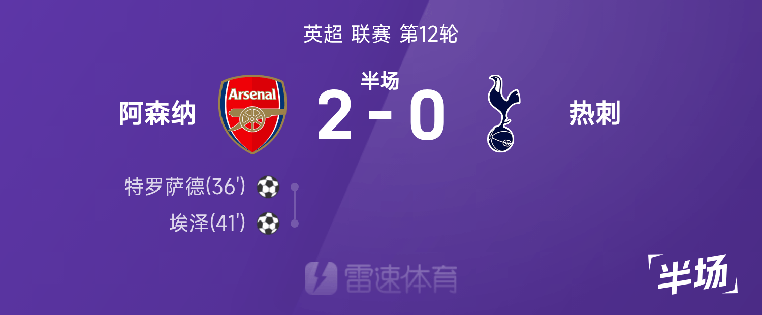雷速體育11月24日訊 25/26賽季英超聯(lián)賽第12輪迎來北倫敦德比,阿森納迎戰(zhàn)熱刺。半場戰(zhàn)罷,雙方比分暫為阿森納2-0熱刺,特羅薩德打破僵局,埃澤再入一球。