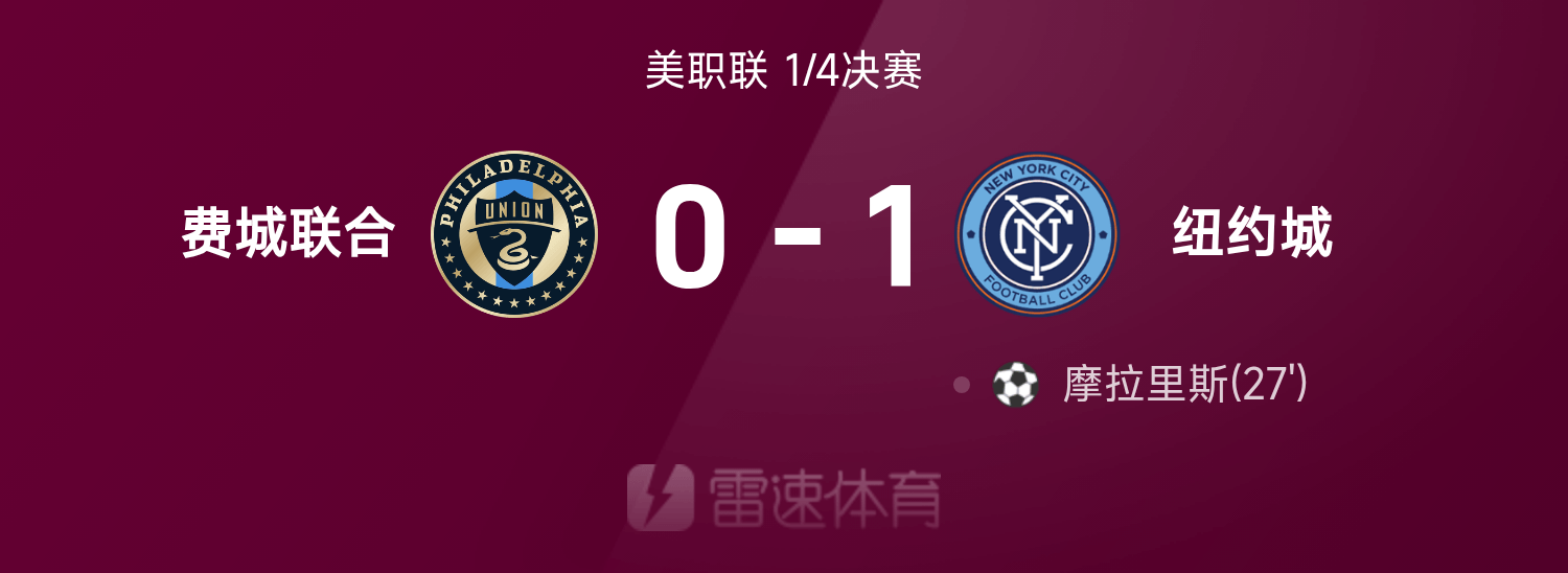 雷速體育11月24日訊 25賽季美職聯(lián)1/4決賽,紐約城1-0戰(zhàn)勝費(fèi)城聯(lián)合。全場(chǎng)比賽,摩拉里斯破門建功。作為常規(guī)賽第一,費(fèi)城聯(lián)合被淘汰出局。而東部決賽,紐約城將對(duì)陣梅西領(lǐng)銜的邁阿密國(guó)際。