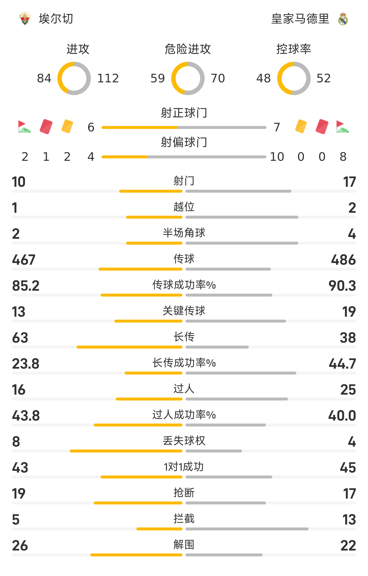 雷速體育11月24日訊 25/26賽季西甲聯(lián)賽第13輪,埃爾切對陣皇家馬德里。上半場,姆巴佩通過門前搶點和反擊單刀頻頻威脅對方球門,埃爾切利用反擊先后由米爾和安德烈·席爾瓦形成禁區(qū)內(nèi)的破門良機,均被發(fā)揮出色的庫爾圖瓦化解。下半場進行到第53分鐘,瓦萊拉巧妙助攻,費巴斯超車阿諾德推射破門,埃爾切1-0領(lǐng)先皇馬。第78分鐘,阿諾德開出角球,貝林厄姆擺渡門前,赫伊森捅射扳平比分。第84分鐘,羅德里格斯單挑皇馬防線勁射破門,埃爾切再次領(lǐng)先。3分鐘后,姆巴佩極限橫敲中路,貝林厄姆門前推射得手,皇馬2-2埃爾切。補時第6分鐘,丘斯特戰(zhàn)術(shù)犯規(guī)拉倒姆巴佩吃到第二張黃牌被逐出。最終皇馬在客場以2-2戰(zhàn)平埃爾切。