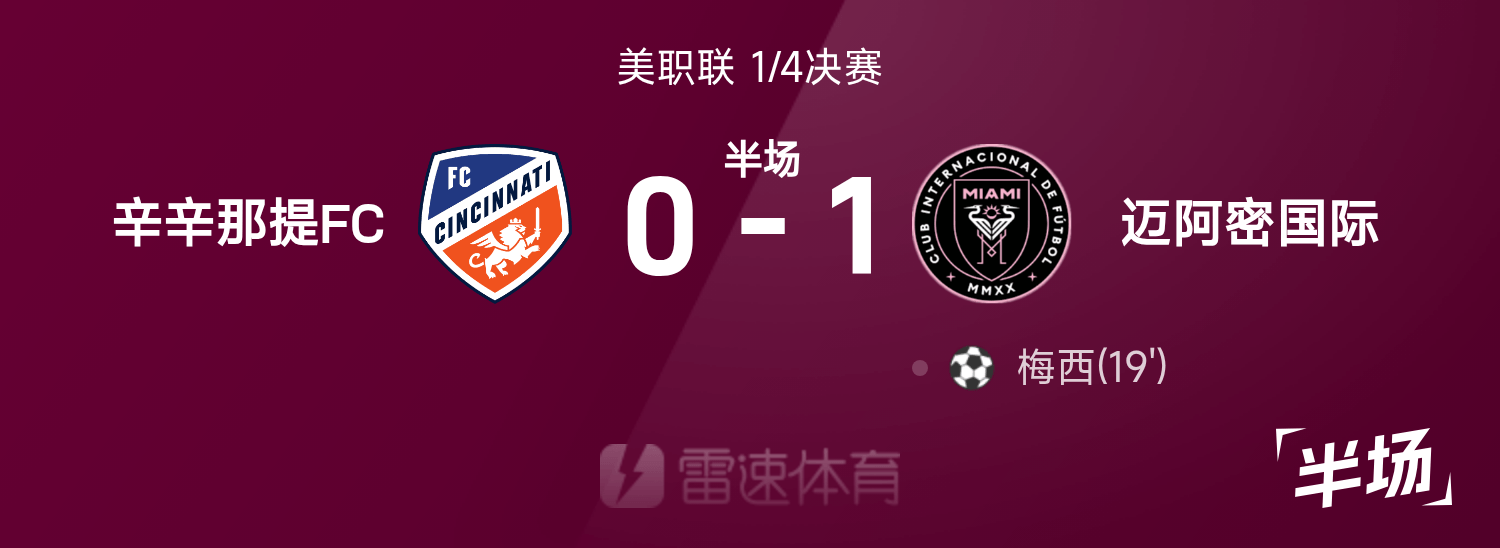 雷速體育11月24日訊 25賽季美職聯(lián)1/4決賽,辛辛那提FC迎戰(zhàn)邁阿密國際。半場戰(zhàn)罷,雙方比分暫為辛辛那提FC0-1邁阿密國際,梅西破門建功。