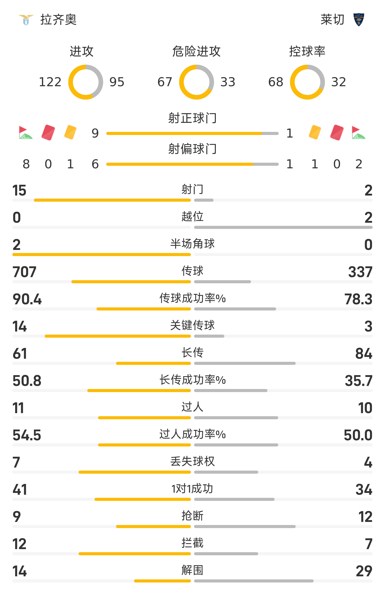 拉齊奧首發(fā)陣容:94-普羅維德爾、13-羅馬尼奧利、77-馬魯西奇、3-佩萊格里尼(75’29-拉扎里)、34-吉拉(87’4-帕特里克)、32-卡塔爾迪(46’5-貝西諾)、26-巴希奇、8-貢多齊、10-扎卡尼、19-迪亞(87’14-諾斯林)、18-伊薩克森(82’9-佩德羅)