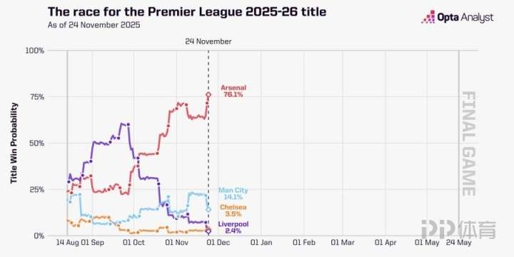 在Opta超算最新的英超奪冠預(yù)測(cè)中,阿森納以76.14%領(lǐng)跑,曼城14.11%第二,利物浦2.42%跌至第四,切爾西3.46%升至第三。