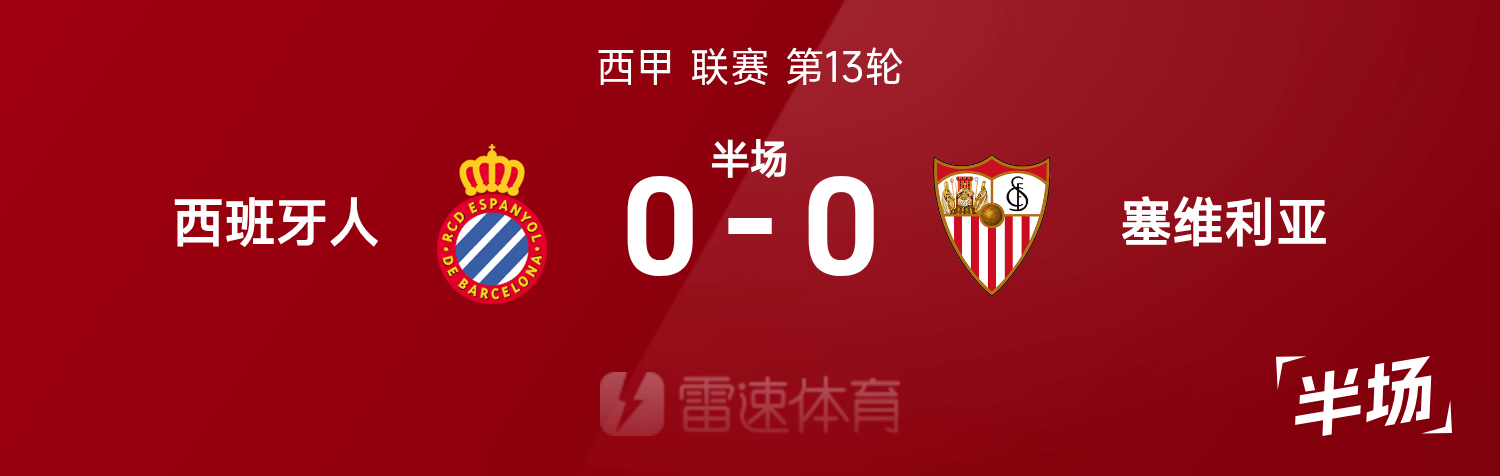 雷速體育11月25日訊 25/26賽季西甲聯(lián)賽第13輪,西班牙人迎戰(zhàn)塞維利亞。半場戰(zhàn)罷,雙方比分暫為西班牙人0-0塞維利亞。