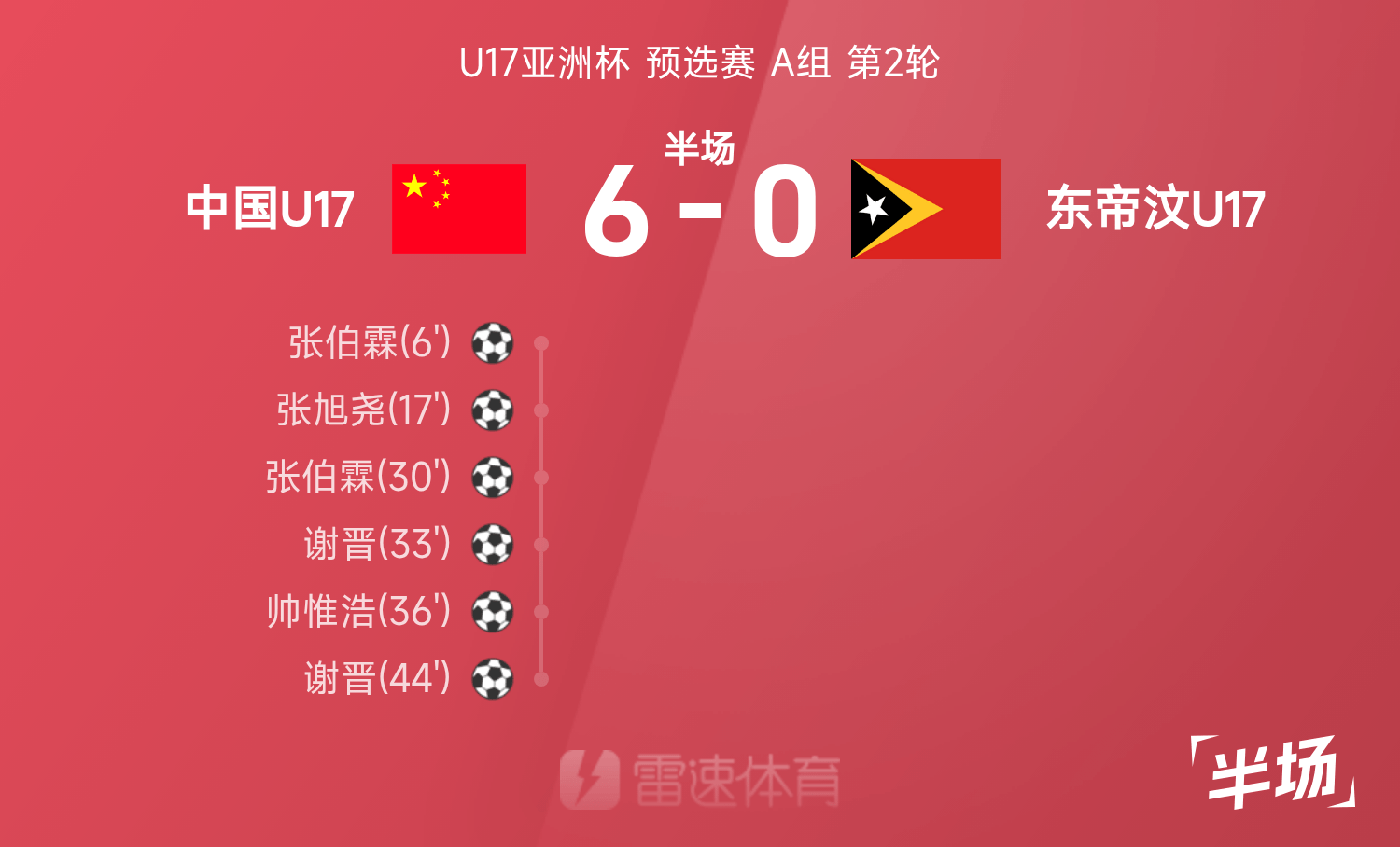 雷速體育11月24日訊 25/26賽季U17亞洲杯預選賽A組第2輪,中國U17迎戰(zhàn)東帝汶U17。半場戰(zhàn)罷,雙方比分暫為中國U176-0東帝汶U17,張伯霖上演梅開二度。