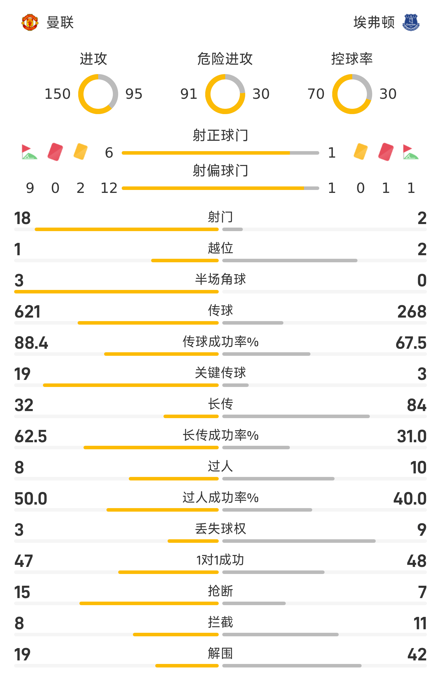 雷速體育11月25日訊 25/26賽季英超聯(lián)賽第12輪,曼聯(lián)對(duì)陣埃弗頓。第14分鐘,蓋耶因防守失誤與基恩在場(chǎng)上發(fā)生激烈爭(zhēng)執(zhí)并掌摑后者,主裁判出示直紅將蓋耶罰下,埃弗頓少打一人。第29分鐘,加納直傳,霍爾先后晃過B費(fèi)和約羅兜射得手,埃弗頓1-0客場(chǎng)領(lǐng)先。隨后曼聯(lián)加強(qiáng)攻勢(shì)并占據(jù)絕對(duì)控球優(yōu)勢(shì),但皮克福德先后化解B費(fèi)、姆伯莫和齊爾克澤等人的威脅射門力保球門不失。最終曼聯(lián)在主場(chǎng)以0-1不敵埃弗頓。