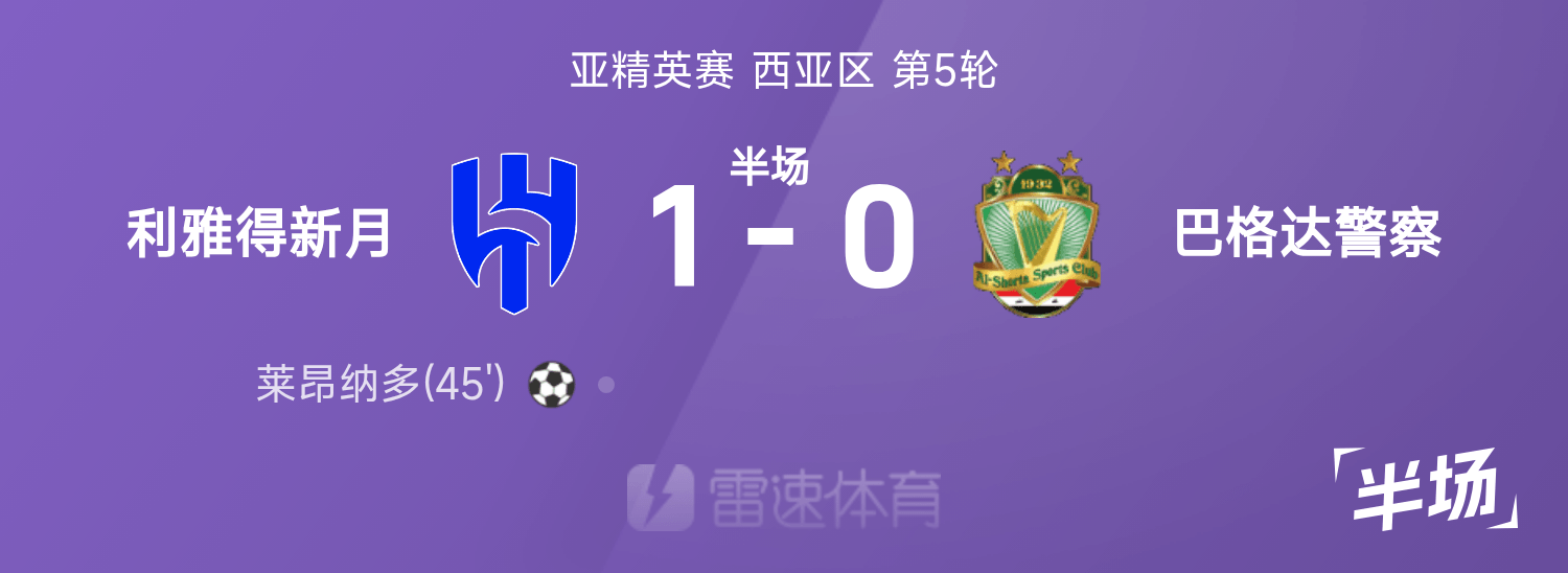 雷速體育11月26日訊 25/26賽季亞精英賽西亞區(qū)第5輪,利雅得新月迎戰(zhàn)巴格達(dá)警察。半場戰(zhàn)罷,雙方比分暫為利雅得新月1-0巴格達(dá)警察,萊昂納多破門建功。