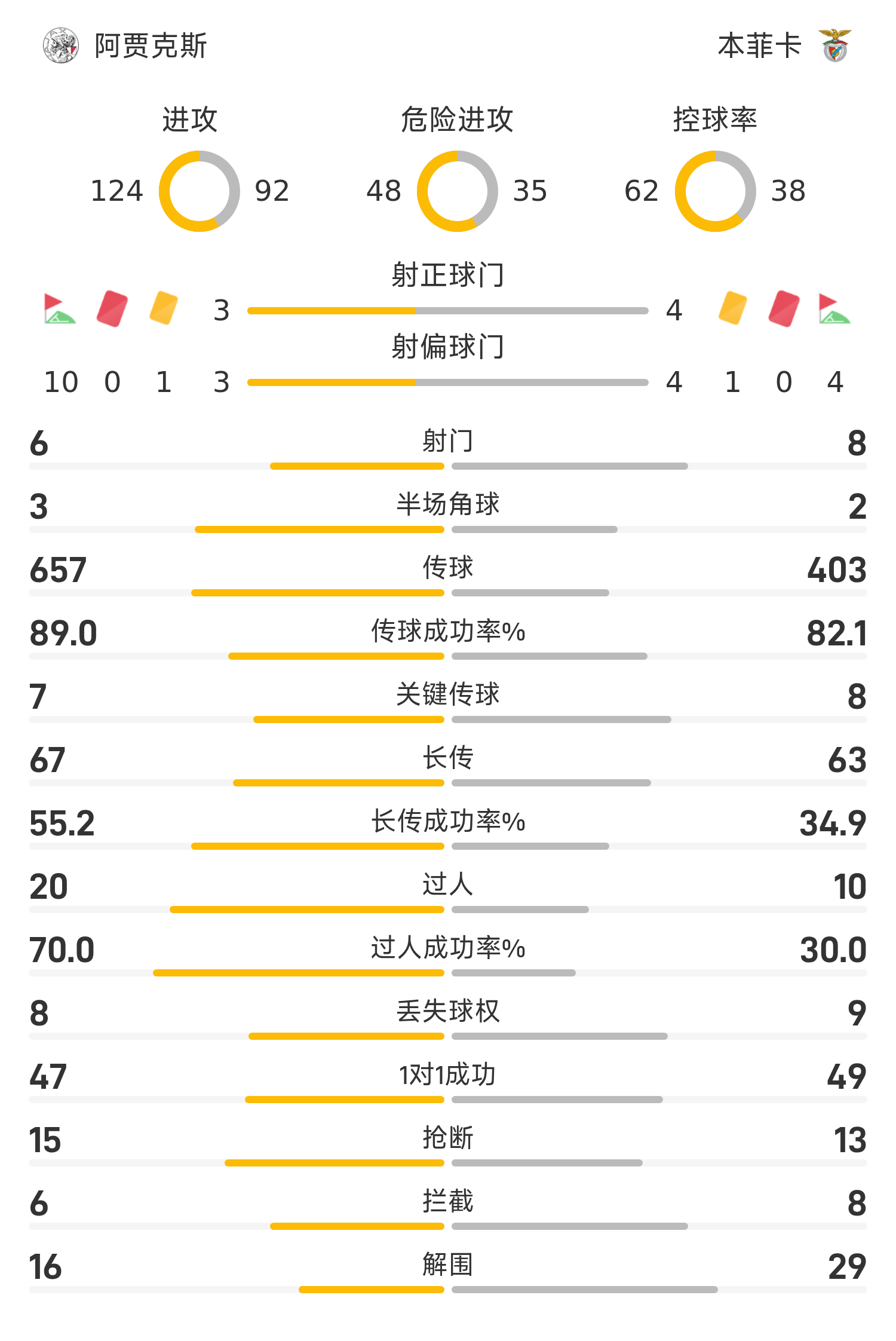 雷速體育11月26日訊 25/26賽季歐冠聯(lián)賽第5輪,本菲卡2-0戰(zhàn)勝阿賈克斯。開場(chǎng)僅6分鐘,達(dá)爾禁區(qū)內(nèi)抽射破門,幫助本菲卡取得領(lǐng)先。領(lǐng)先后的本菲卡選擇退縮防守,盡管阿賈克斯創(chuàng)造出了不少機(jī)會(huì),但由于門前把握機(jī)會(huì)能力欠佳,始終未能扳平比分。比賽最后時(shí)刻,巴雷羅反擊破門,將比分改寫為2-0,幫助本菲卡鎖定勝局。
