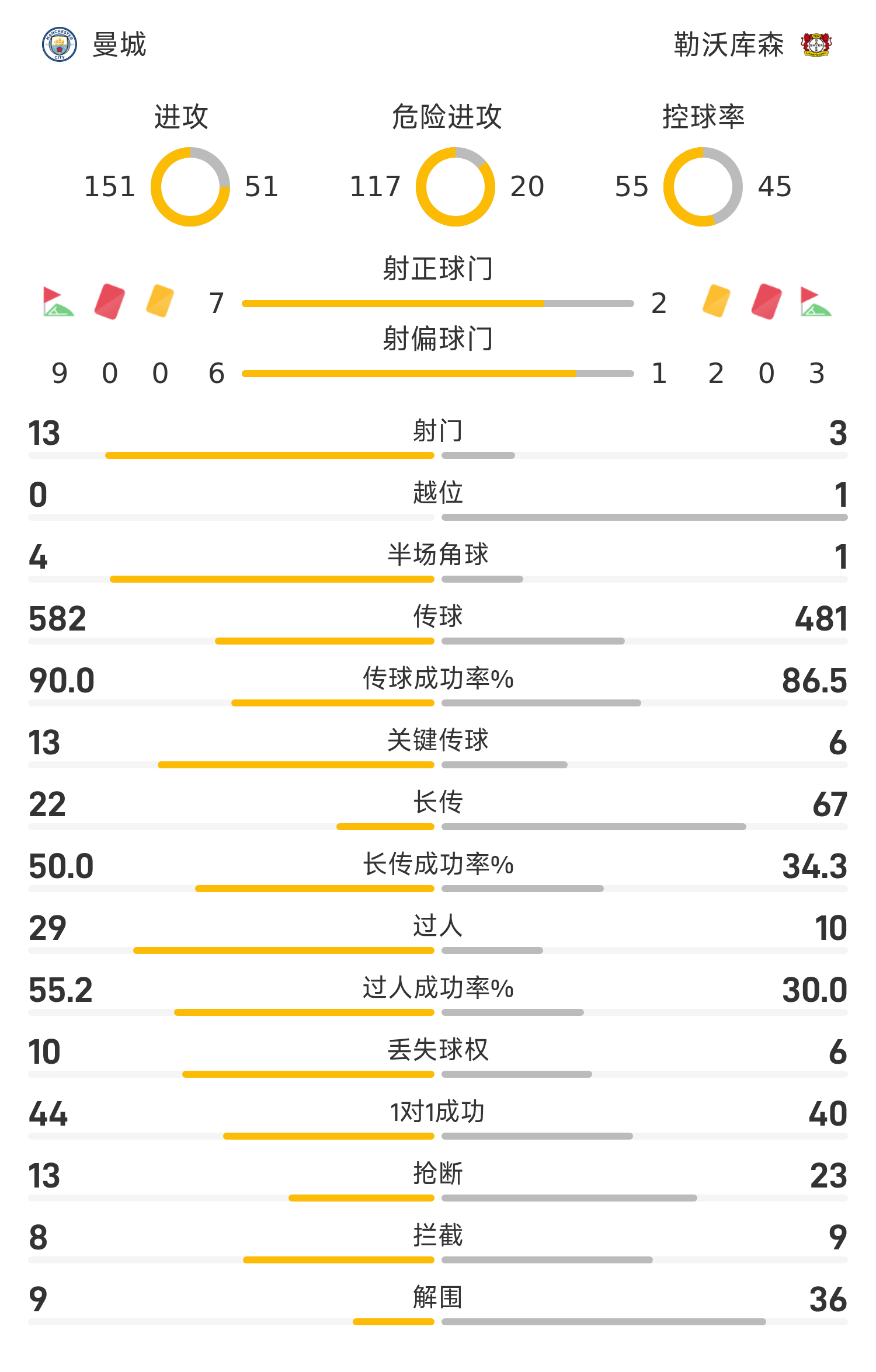 雷速體育11月26日訊 25/26賽季歐冠聯(lián)賽第5輪,勒沃庫(kù)森2-0戰(zhàn)勝曼城。全場(chǎng)比賽,格里馬爾多抽射建功、希克頭球破門,謝爾基任意球造險(xiǎn),弗萊肯屢次救主,曼城大輪換遭遇歐冠首敗和各項(xiàng)賽事兩連敗。