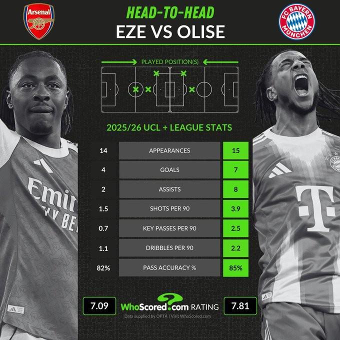 知名數(shù)據(jù)網(wǎng)站“WhoScored”對比昔日水晶宮雙星埃澤、奧利塞本賽季關(guān)鍵數(shù)據(jù),后者均占優(yōu)。今日凌晨,阿森納將與拜仁在歐冠相遇,兩人將展開直接對話。
