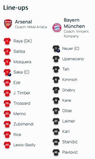 北京時(shí)間11月27日04:00,歐冠 聯(lián)賽階段 第5輪,阿森納主場(chǎng)迎戰(zhàn)拜仁慕尼黑,賽前雙方球隊(duì)首發(fā)名單公布如下: