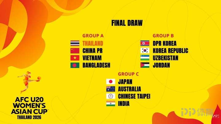 2026年泰國U20女足亞洲杯抽簽儀式進行,中國U20女足與泰國、越南、孟加拉國同組。